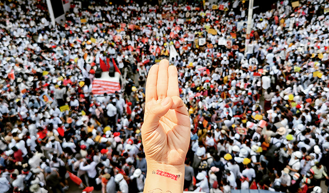 Part of a documentary project titled #Response365—a reiteration of an earlier project—this photograph was one of many posted once a day for a year, in response to the 2021 military coup in Burma. In uploading such provocative images to her Instagram account (@emily_phyo), Phyo facilitates a transformation of her social media platform into a subversive online space for recording on-the-ground developments in real-time, as the military targeted press and journalists. With all the urgency and immediacy evoked in a quick photographic snapshot, Phyo pictures the notorious three-finger salute—a symbol transposed from a dystopian young adult fiction trilogy to become a real and salient sign of resistance in contemporary Burma. Irreverent and stubbornly defiant, Phyo’s act of documentation—which has continuously fixated on the human body, often the artist’s own—makes visible ongoing realities of political protest, survival and perseverance, while bearing witness to the imbrication of human lives in a landscape of political turmoil and repression. Below is Phyo’s account of the day the photograph was taken.