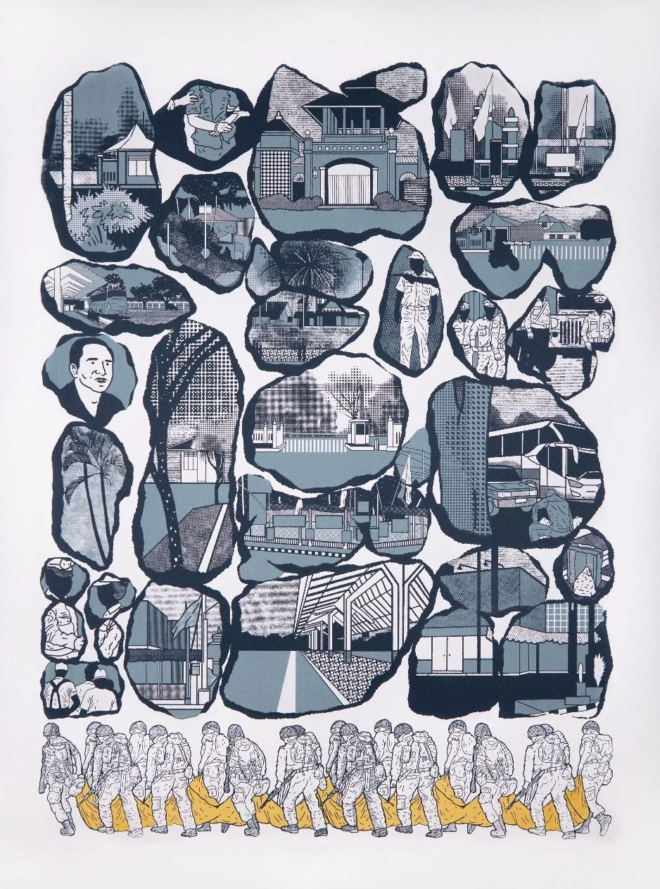 Alfin Agnuba in collaboration with Krack Studio, Menggali-gali 2024. Screenprint on 100% cotton Clairefontaine paper 200 x 150 cm