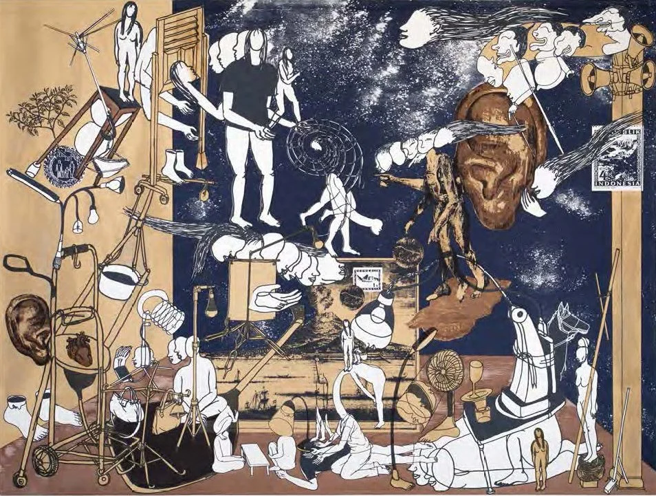 Ipeh Nur’s screenprint explores the chaotic second-hand markets of Java—known as Pasar Senthir or Pasar Klitikhan. Her work reflects on the life cycles of objects, showing how discarded or broken items are given new meaning. Created using natural pigments like indigo, cloves, charcoal, and clay, her piece also references Indonesia’s colonial history and the cultural significance of these materials. Ipeh’s contribution offers a rich study in materiality, symbolism, and socio-historical context. Her use of traditional dyes connects artmaking to environmental and historical narratives, while the subject matter invites reflection on consumerism, value, and cultural memory. Students can explore how materials and technique shape meaning, and how art can comment on cycles of use, waste, and renewal within society.