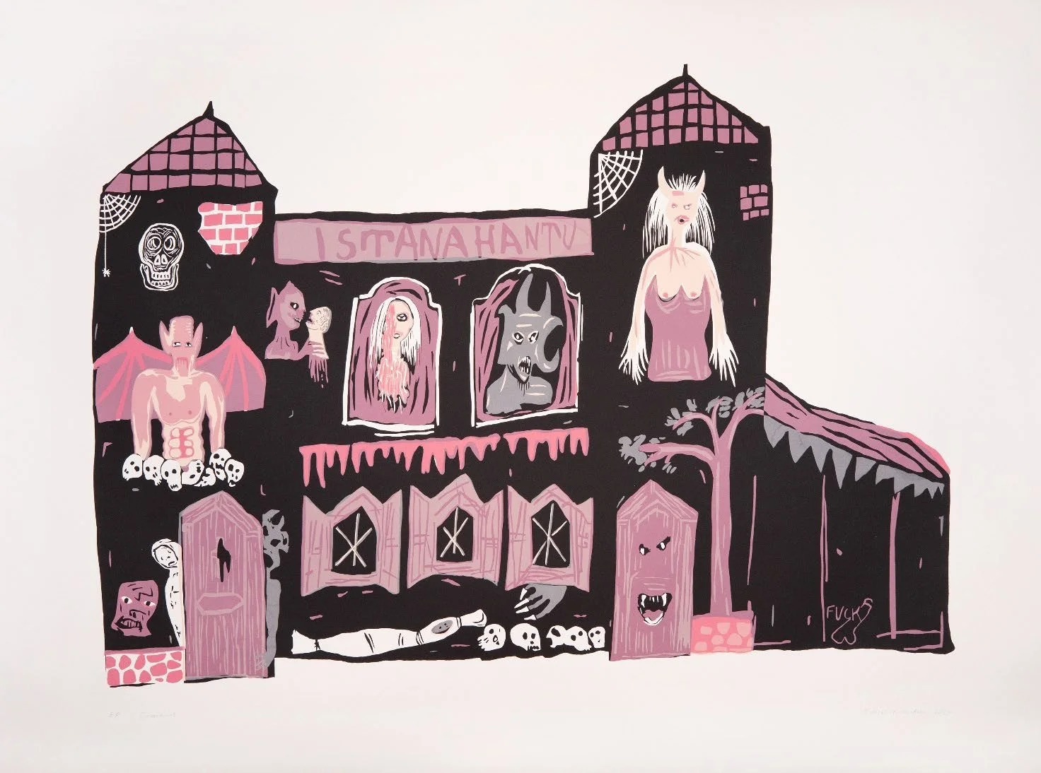Tobias Richardson’s studio based practice is informed by travel, community and artist residencies. He incorporates autobiographical investigation expressed through the depiction of built environments. In 2015 he visited Krack in Yogyakarta and created a series of gouache paintings of haunted houses at the annual Sekaten night market. For This exhibition Krack worked with him to create a large scale recreation of one of those works.
