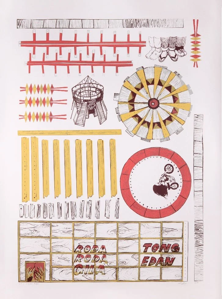 For Pasar Malam, Restu presents Roda Roda Gila (Crazy Wheels), a screenprint depicting the Tong Edan—a thrilling night market attraction where motorcyclists ride inside a giant timber barrel. The print mimics a paper toy or blueprint, inviting viewers to imagine cutting and assembling a scale model of the spectacle. This playful approach contrasts with the danger and daring of the performance, highlighting themes of engineering, entertainment, and cultural nostalgia.
